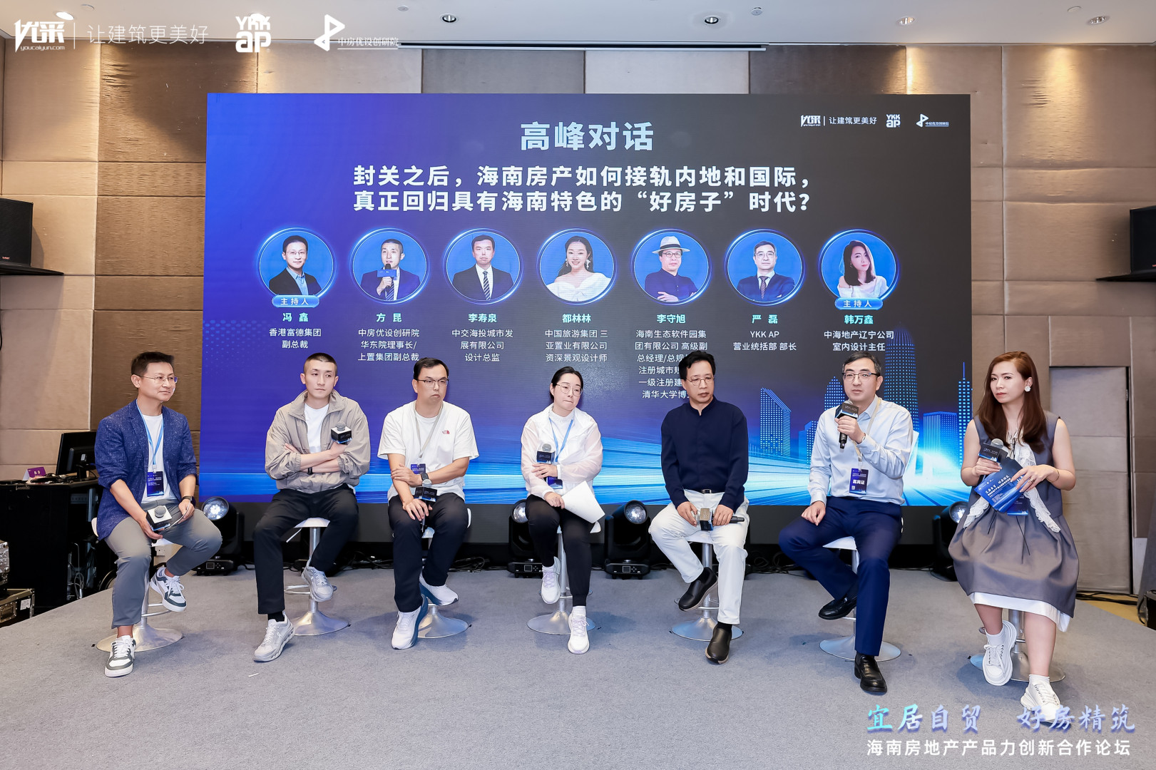 一场汇聚一线房企、本土专家、供应链企业的高峰对话在论坛现场精彩上演,由中房优设创研院海南院理事长/香港富德集团副总裁冯鑫、中房优设创研院海南院副理事长/中海地产辽宁公司室内设计主任韩万鑫主持。中房优设创研院华东院理事长/上置集团副总裁方昆、中交海投城市发展有限公司设计总监李寿泉、中国旅游集团三亚置业有限公司资深景观设计师都林林、海南生态软件园集团有限公司高级副总经理/总规划师/注册城市规划师/一级注册建筑师/清华大学博士李守旭、YKK AP 营业统括部部长严磊,这六位嘉就核心议题展开深入交流。