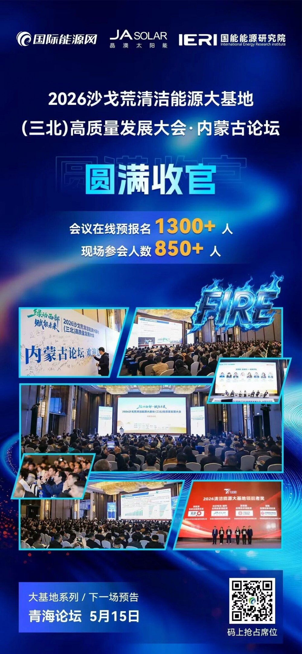 本次大会为行业搭建了交流合作平台,有助于探索内蒙生态治理与能源开发协同并进、经济效益与社会效益和谐统一的清洁能源可持续发展之路。论坛的圆满落幕,不是终点而是新起点。5月15日,大会第二场将移师青海西宁,继续聚焦沙戈荒清洁能源大基地建设,汇聚更重磅嘉宾、探讨更前沿议题、搭建更广阔合作平台。