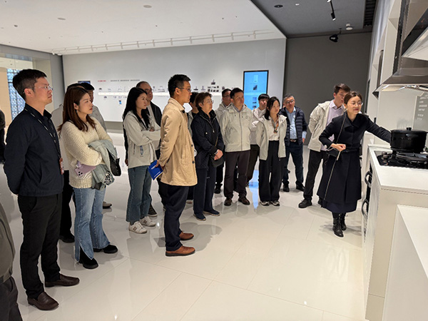 随后,家电班前往方太集团总部,深度解码未来工厂背后的技术密码。走进方太企业展馆,1.5万平方米的空间里浓缩了品牌28年的创新历程。从1996年首台深型吸油烟机破解行业难题,到如今AI语音控制嵌入式厨电、氮气保鲜冰箱等黑科技产品,同学们驻足在“专利隧道”前,惊叹于方太1.7万项专利背后的研发实力。宁波方太厨具有限公司(以下简称方太)产品&研究质量运营总监、九期家电班学员魏俊热情接待了家电班的同学们,并陪同大家参观了展厅及智慧厨电产品智能工厂。工厂通过RFID采集系统、CCD视觉检测等数十种智能装备,构建起“感知-决策-执行”的闭环体系,生产效率较传统模式提升36.8%,运营成本降低22.9%。从原材料入库到成品下线,每25秒就有一台油烟机或洗碗机完成全流程生产,关键工序自动化率达95%以上。供应链协同平台展示了从顾客需求对接、产品研发到仓储物流,所有环节通过数据中台实时联通,甚至能提前预警供应商产能波动。以集成烹饪中心为例,研发数据直接同步到生产线后,从设计到量产周期缩短了30.3%。方太厨电事业部制造应用中心高级经理孙小兵分享了方太集团智能工厂的建设与发展,以及供应链数字化转型的实践经验。