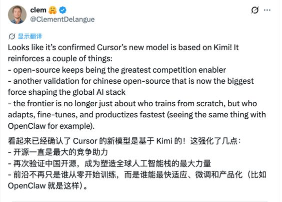 从DeepSeek到Kimi,Cursor的“自研模型”的底座换了一轮又一轮,但都出自中国。一个事实是,中国开源模型正在构成全球AI应用层的地基。Hugging Face联创和CEO克莱门特·德朗格近日就指出,中国的开源模型如今已成为塑造全球AI技术栈的最大力量。