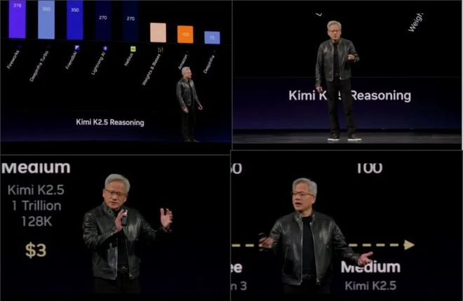 3月17日,黄仁勋在GTC 2026将中国开源模型Kimi K2.5作为展示下代芯片能力的基准模型。3月18日,杨植麟直接在GTC的分论坛上solo,成为了现场唯一来自独立大模型公司的代表,分享Kimi K2.5的进化路线,并将Kimi的进化逻辑归纳为三个维度的共振:Token效率、长上下文以及智能体集群(Agent Swarms)。