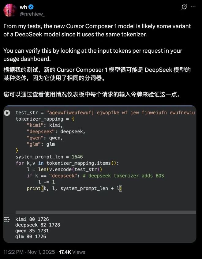 Cursor被质疑“套壳”的相同场景,此前也在DeepSeek身上上演过。去年11月,Cursor发布新模型Composer-1时,就将其标榜为“自家首个编码模型”、“智能体编程最佳方式”。结果有网友发现,新模型干着干着活就开始说中文,有网友发现,Cursor Composer-1和DeepSeek用的是同样的分词器,因此推测所谓新模型很可能是DeepSeek的变体。