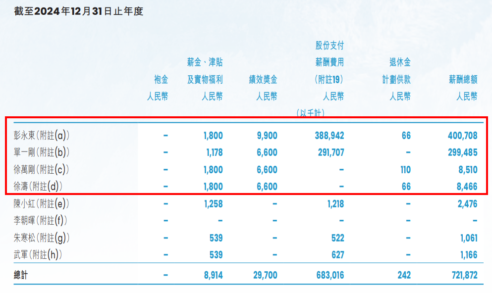 2024年:彭永东的薪酬为4.01亿元,单一刚的薪酬2.99亿元,徐万刚的薪酬为851万元,徐涛的薪酬为846.6万元。