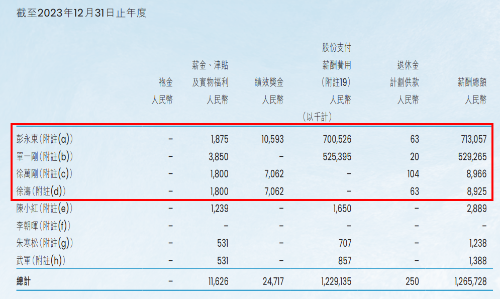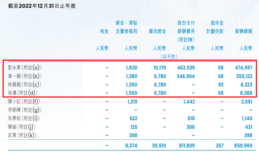 2022年,彭永东的薪酬为4.75亿元,单一刚的薪酬3.55亿元(22年起,这两位的包含股份支付,下同)徐万刚的薪酬为822.3万元,徐涛的薪酬为838.8万元。