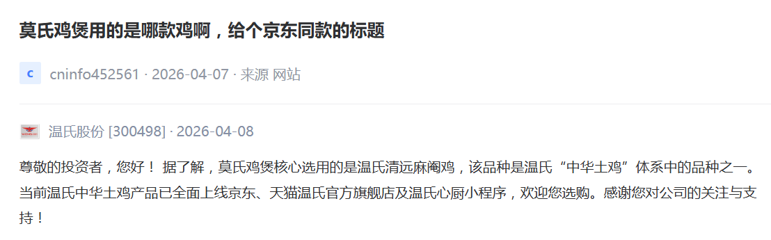 这一回应将外界的“食言”质疑转化为上市公司的合规性解释。尽管有网友调侃“热点都把握不住”,但不可否认,温氏股份借势“莫氏鸡煲”的热度,成功将“中华土鸡”产品推向公众视野。