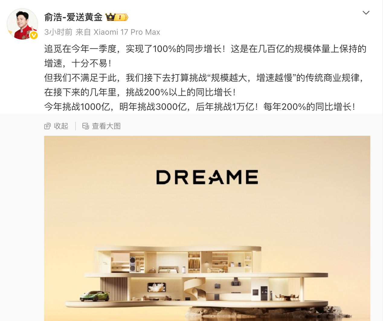 他在微博公布了一季度成绩单:追觅在几百亿的规模体量上实现了100%的同比增长。