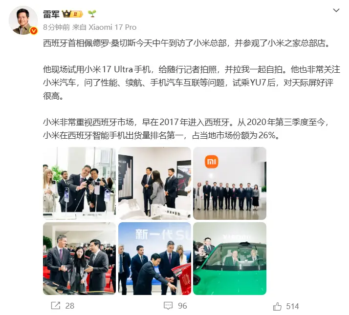 4月13日消息,小米创始人,董事长兼CEO今日在社交平台发文,分享西班牙首相佩德罗桑切斯今日到访小米北京总部,并参观小米之家总部店,雷军陪同参观体验。