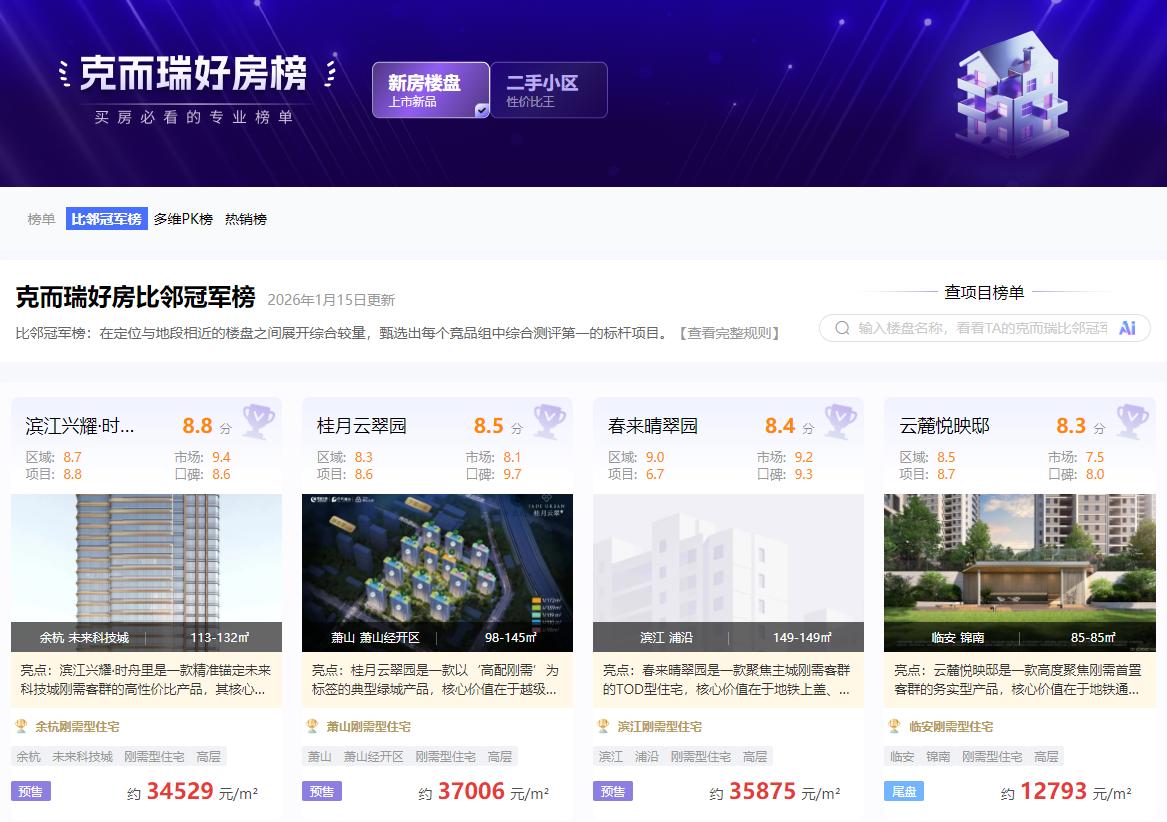 在浙江买房,如何挑选好房?克而瑞·好房点评网比邻冠军榜来帮忙。
