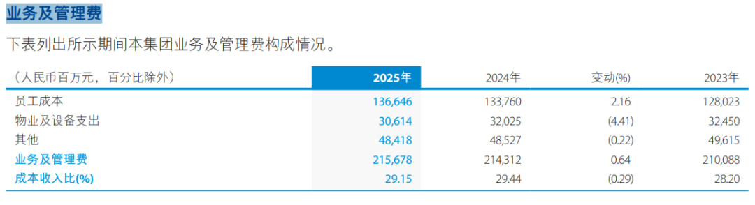 支出方面,2025年,建行持续加强全面成本管理,提升费用开支效率,成本收入比29.15%,较上年下降0.29个百分点。业务及管理费2,156.78亿元,较上年增加13.66亿元,增幅0.64%。