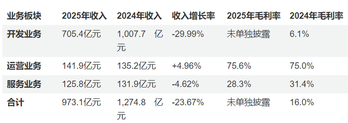 其二,真正的利润来源从“卖房”变成“收租+服务”,虽然营业收入上地产开发业务实现收入705.4亿元,运营业务收入141.9亿元,物业和代建组成的服务业务收入125.8亿元,但开发业务期内溢利由盈转亏,全年分部溢利亏损约81.4亿元,是核心亏损的主要拖累。