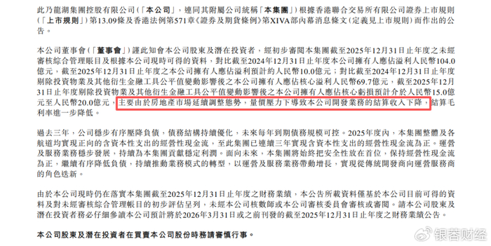业绩预告中,龙湖解释这一情况主要是由于房地产市场延续调整态势,量价压力下导致公司开发业务的结算收入下降,结算毛利率进一步降低。