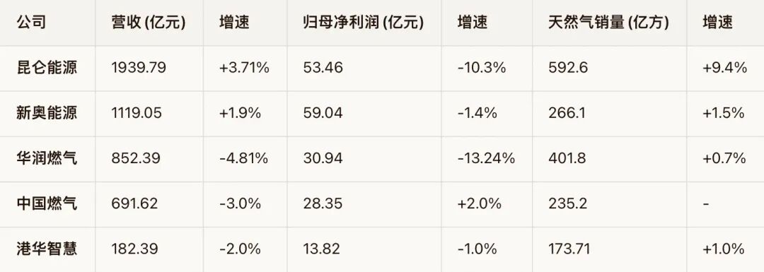 相比之下,传统城燃巨头面临严峻挑战。华润燃气归母净利润同比下降13.24%,昆仑能源虽营收大增但利润下滑10.30%。这反映出在气价波动和需求疲软的夹击下,单纯依赖销气价差的传统模式已难以维系。