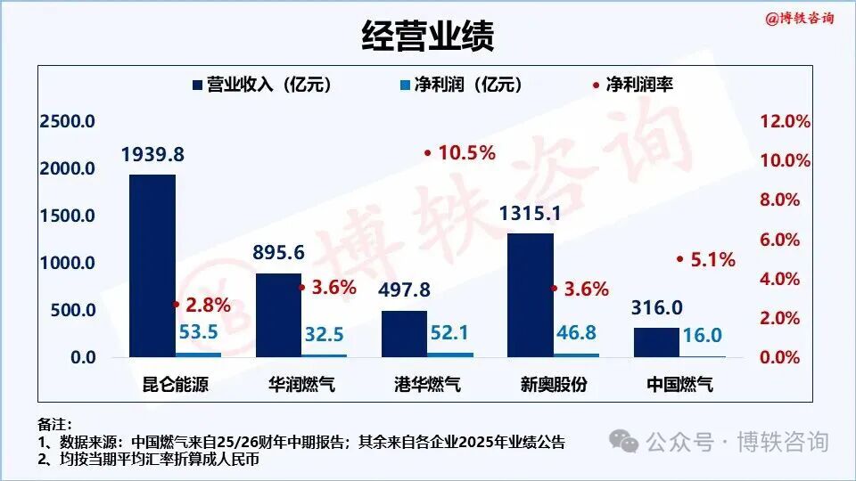 基于2025年最新披露的年度业绩数据,城燃五虎(昆仑能源、华润燃气、新奥股份、中国燃气、港华智慧能源)呈现出显著的业绩分化。整体来看,行业已全面进入“存量博弈”与“质量为王”的新阶段。营收规模虽有支撑,但利润端普遍承压,唯有具备强大资源整合能力与综合能源服务转型的企业方能突围。