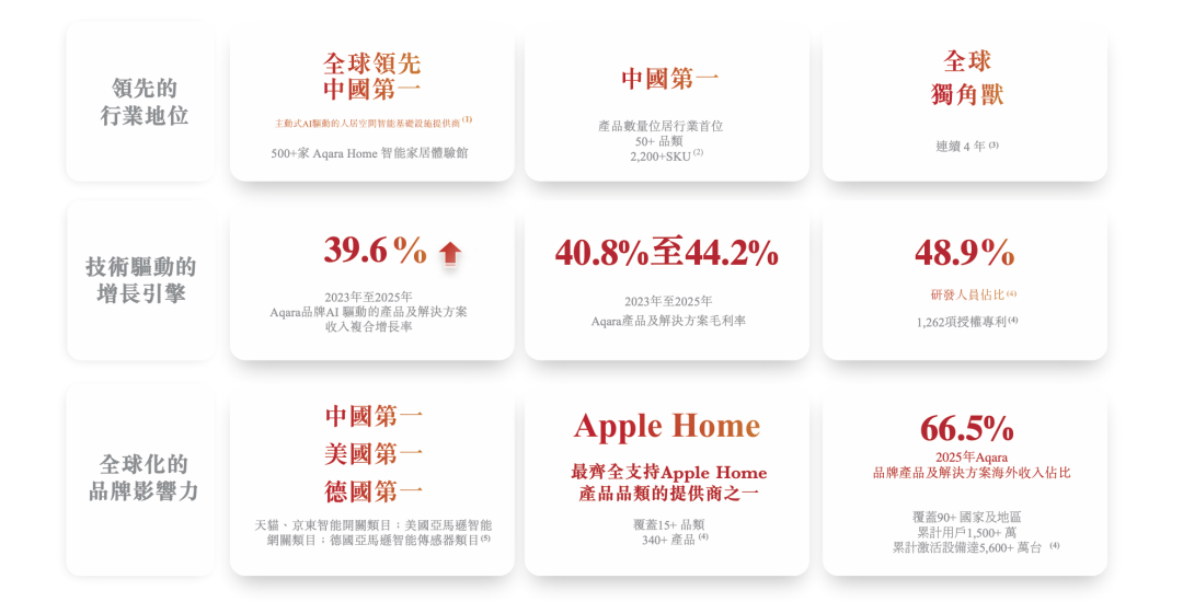 值得注意的是,绿米联创还已建立真正的国际商业化及规模化的销售布局,现已覆盖中国境外超过90个国家和地区,2025年12月31日的全球销售渠道网络已服务全球超过1500万用户——2023年至2025年,Aqara品牌空间智能产品和解决方案的海外收入复合年增长率为28.7%。此外,Aqara品牌产品与解决方案的海外收入在总收入的占比从2023年的42.2%提升至2025年的66.5%。