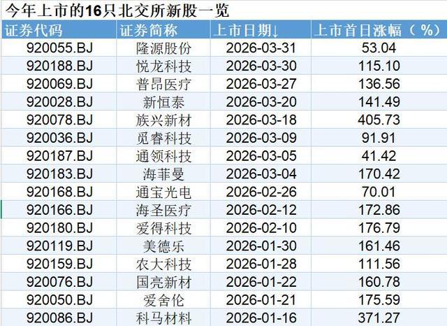 叠加北交所当前“0破发”的市场环境,其收益预期被进一步抬高。根据东方财富Choice数据,北交所新股已连续两年上市首日无破发。2026年一季度,16只新股上市首日平均涨幅达160%。