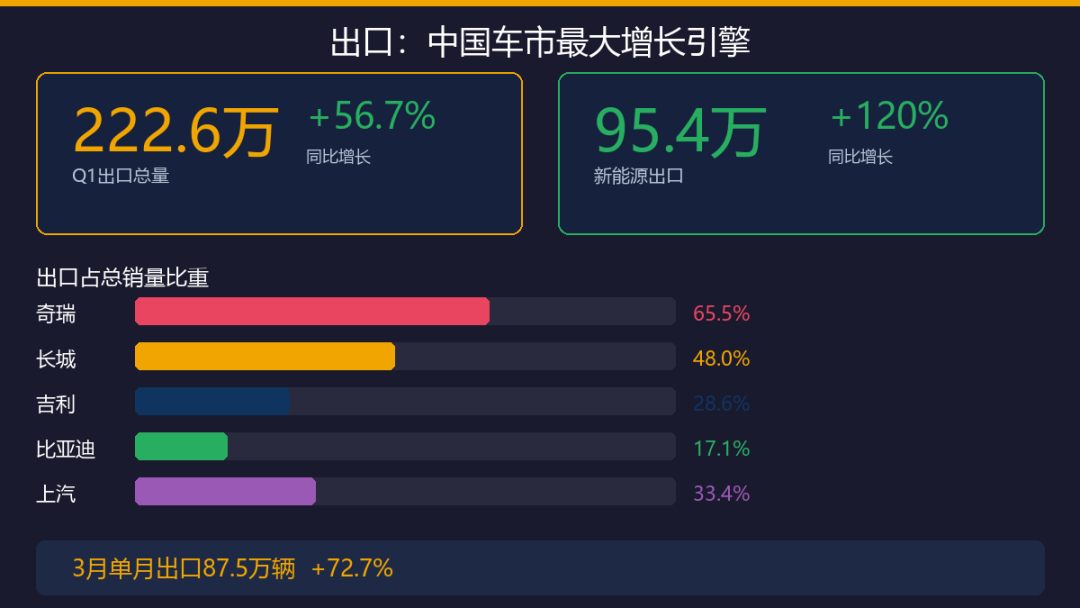 Q1最亮眼的数字不是销量,是出口。222.6万辆,同比增长56.7%。新能源出口95.4万辆,同比增长120%。3月单月出口87.5万辆,创历史新高。