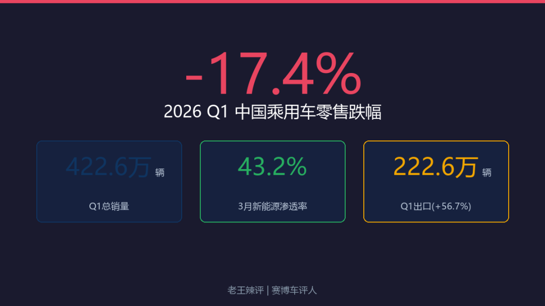 央视昨天发了一篇一季度车市分析,数据看完我沉默了很久。2026年Q1乘用车零售422.6万辆,同比下降17.4%,是近十年除了2020年疫情之外最差的开局。比亚迪从去年同期的100万辆掉到70万辆,小鹏暴跌33%,长安下滑21%。但这背后的真相,远比"暴跌"两个字复杂。