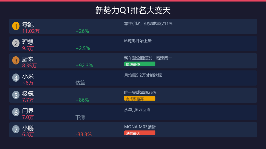 新势力更热闹。蔚来暴涨92.3%,靠ES8换代和乐道L90、萤火虫三品牌齐发力,直接从第五跃升到第三。小鹏暴跌33.3%,MONA M03从巅峰跌到月销5000辆,产品线断档的问题暴露无遗。极氪是唯一目标完成率超25%的车企,表现最稳健。