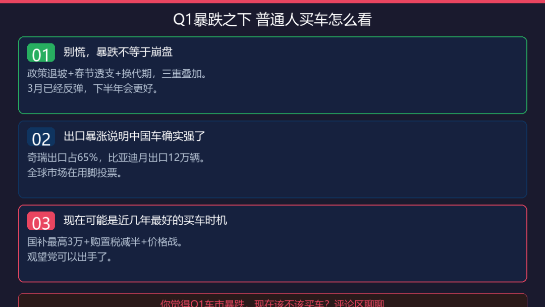 先说原因。Q1车市暴跌有三个叠加因素:政策退坡(去年底以旧换新政策透支了大量需求)、春节错位(今年春节在1月底,2月基本是空窗期)、产品换代期(大量车企在为4月北京车展憋大招,新车型还没放量)。