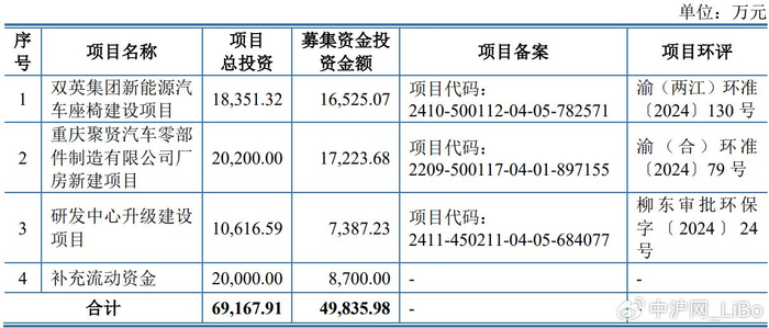 据招股书显示,双英集团拟募集资金68,052.77万元,募集资金扣除本次发行费用后将分别用于双英集团新能源汽车座椅建设项目、重庆聚贤汽车零部件制造有限公司厂房新建项目、研发中心升级建设项目、补充流动资金,具体如下: