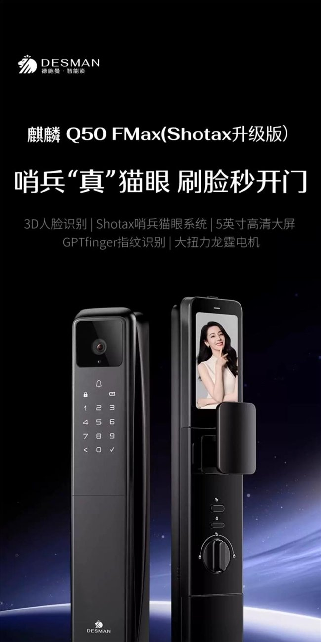 德施曼Q50FMax聚焦人脸识别技术升级,成为指纹识别困难用户的优选。深度人脸识别算法搭配高清双目摄像头,动态捕捉人脸信息,不同妆容、光线条件下均能精准识别;Shotax哨兵猫眼系统配备双红外夜视补光,完全黑暗环境下也能清晰捕捉门外动态,保障夜间安防。4英寸高清可视大屏与双锂电续航,兼顾使用便捷性与稳定性。