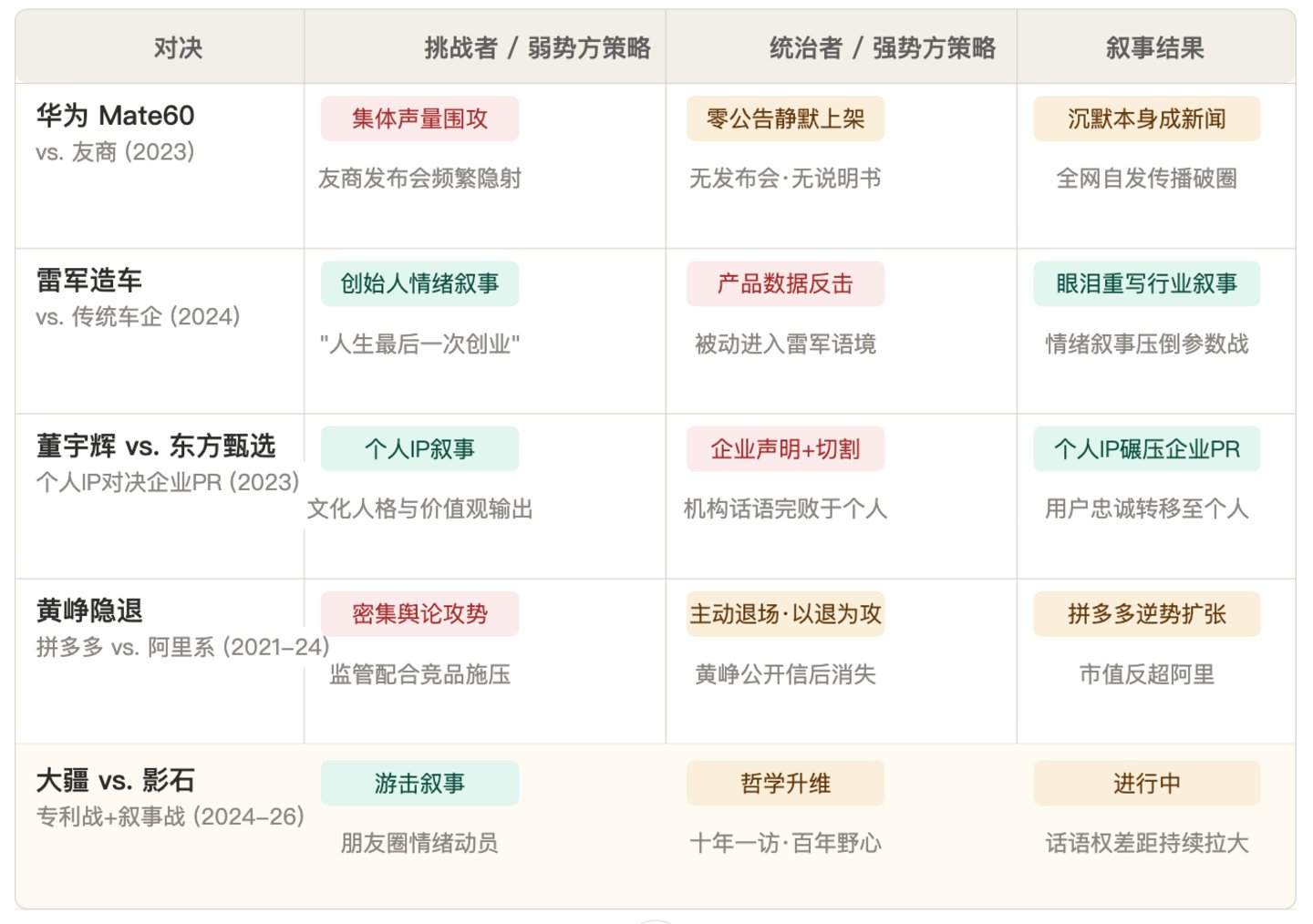 大疆与影石的这套攻防战并非孤例,参考历史上更多的公关战,有几个底层逻辑,是公关操盘手和老板们绕不开的。