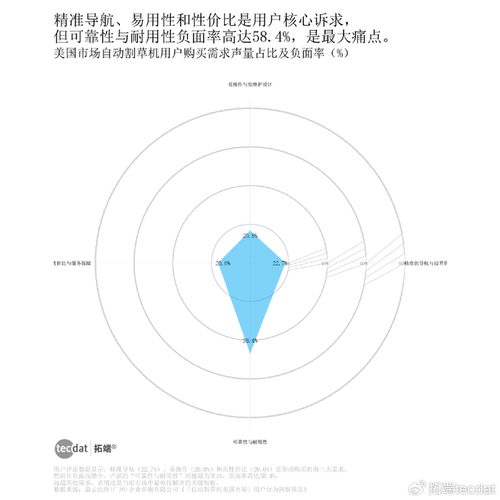 3秒解读:用户购买自动割草机最关注精准导航、易用性和性价比,但可靠性与耐用性负面率近六成,是产品改进的核心方向。
