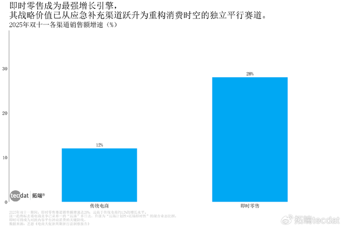 在渠道增速方面,即时零售表现亮眼。2025年双十一期间,即时零售赛道销售额增速达28%,远高于传统电商约12%的增长水平。这一趋势标志着电商竞争已从单一的“远场”多日达,升级为“远场计划性+近场即时性”的混合业态比拼,即时可得成为对抗内容平台冲动消费的关键防线。