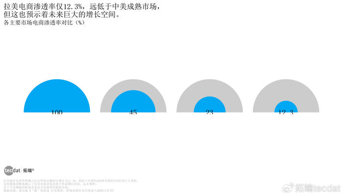3秒解读:拉美电商渗透率仅为中美市场的三分之一到二分之一,未来增长潜力巨大,是跨境出海的重要增量市场。