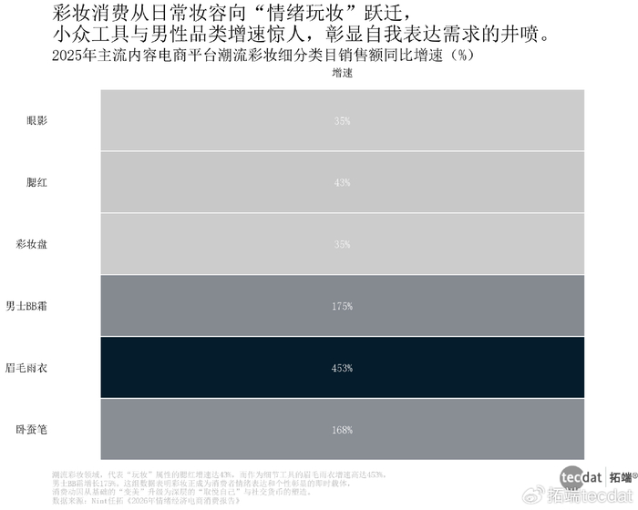 在潮流彩妆细分领域,消费趋势也从日常妆容向“情绪玩妆”跃迁。代表“玩妆”属性的腮红增速达43%,而作为细节工具的眉毛雨衣增速高达453%,男士BB霜增长175%。这组数据表明彩妆正成为消费者情绪表达和个性彰显的即时载体,消费动因从基础的“变美”升级为深层的“取悦自己”与社交货币的塑造。