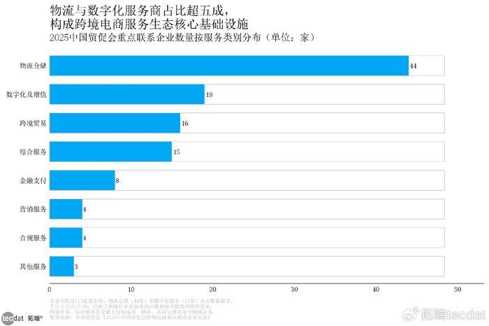 跨境电商的蓬勃发展离不开完善的服务生态支撑。在113家重点联系企业中,物流仓储企业数量最多,达44家,数字化及增值服务企业紧随其后,有19家,两者合计占比55.8%,构成了服务生态的核心。跨境贸易、综合服务、金融支付等企业则构成第二梯队,共同支撑卖家的全链路业务需求。