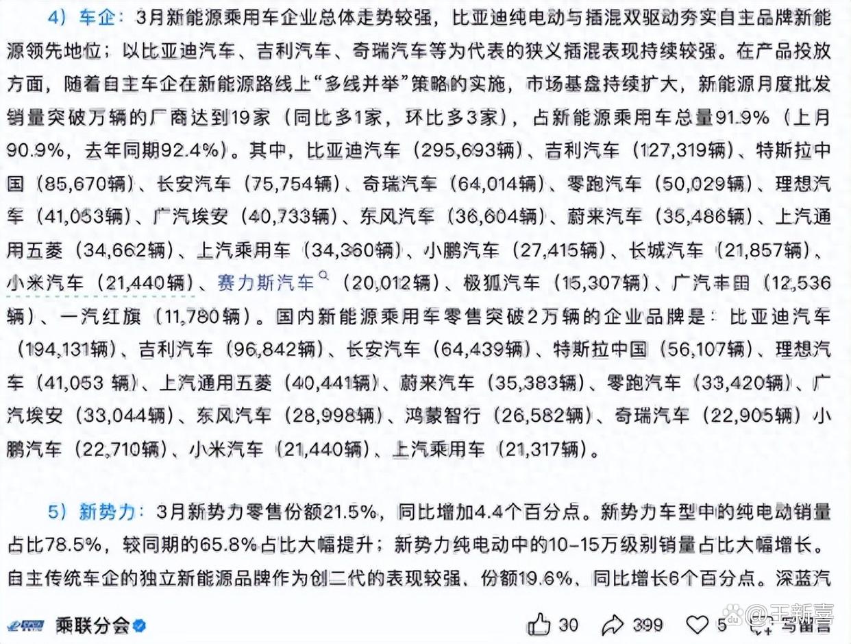 尽管赛力斯增长依然耀眼,但问界M7销量由2月10093辆跌至8383辆,跌近两成!此外,奇瑞汽车产销公告显示,3月智界销量为2,579辆,同比下滑超七成。