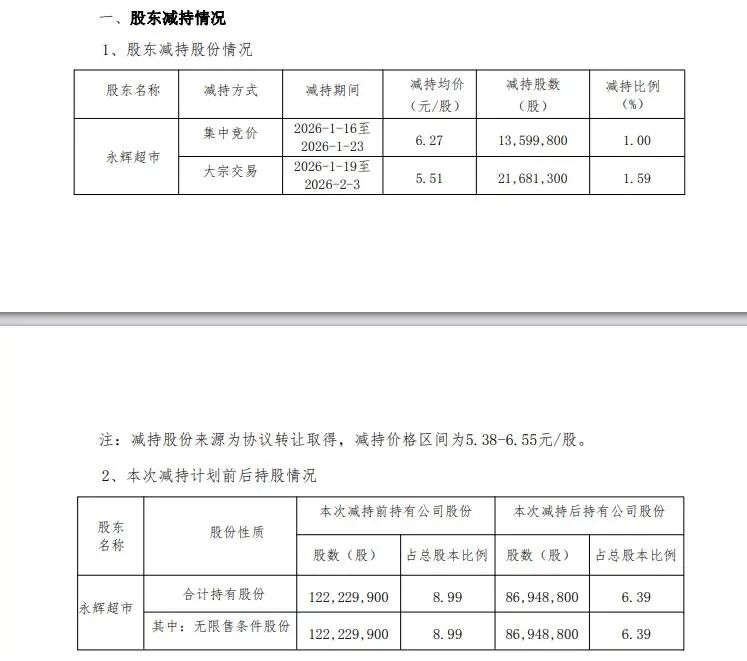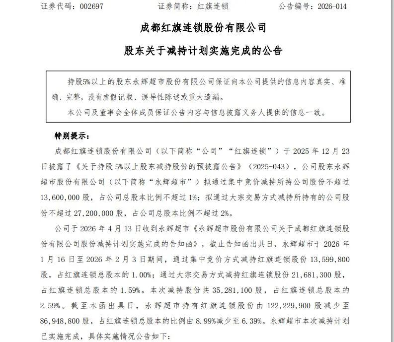 公告显示,永辉超市于2026年1月29日至2026年2月3日期间,通过大宗交易方式累计减持红旗连锁610.98万股,占红旗连锁总股本的0.45%,占其自身持有红旗连锁股份总数的6.57%。