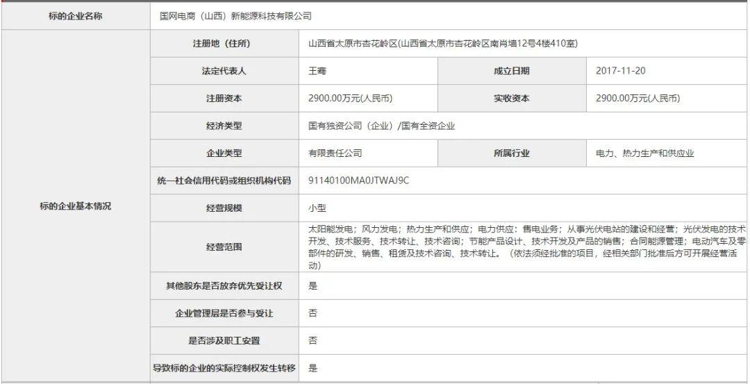 这份挂牌信息里,藏着这场资产甩卖的核心细节:这家2017年成立的山西子公司,注册地在太原杏花岭区,注册资本2900万元,主营光伏、风电、售电等业务,是典型的区域型新能源项目公司。转让底价中,1740万元为股权款,剩余1162万元为转让方持有的债权,受让方需同步承接。更关键的是,本次转让将直接导致标的公司实际控制权发生转移,意味着这家央企子公司将彻底告别国网体系。