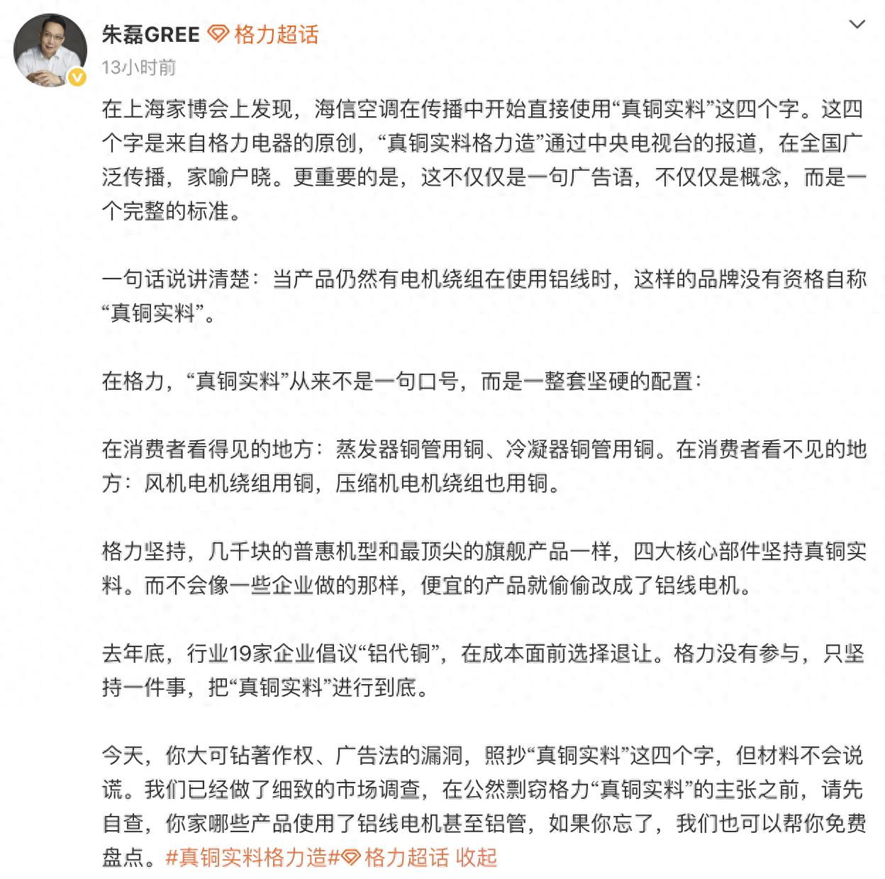 4月14日,格力电器市场总监朱磊在社交平台发文,直指海信空调在上海家博会上直接使用格力原创的“真铜实料”四字进行宣传,更尖锐指出:当产品仍有电机绕组使用铝线时,这样的品牌没有资格自称“真铜实料”。图片来源:格力朱磊个人微博