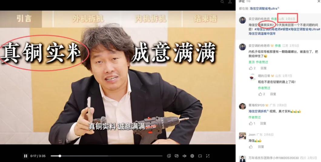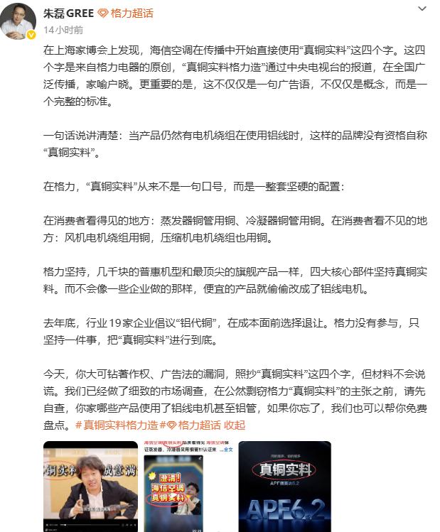 朱磊表示,在上海家博会上发现,海信空调在传播中开始直接使用“真铜实料”这四个字。这四个字是来自格力电器的原创。他同时称,海信这是公然剽窃。