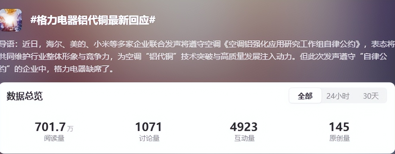 然而,这场公约,空调行业的大哥格力缺席了,随后,相关话题冲上热搜,对于为何缺席,格力回应称:目前没有铝代铜计划。