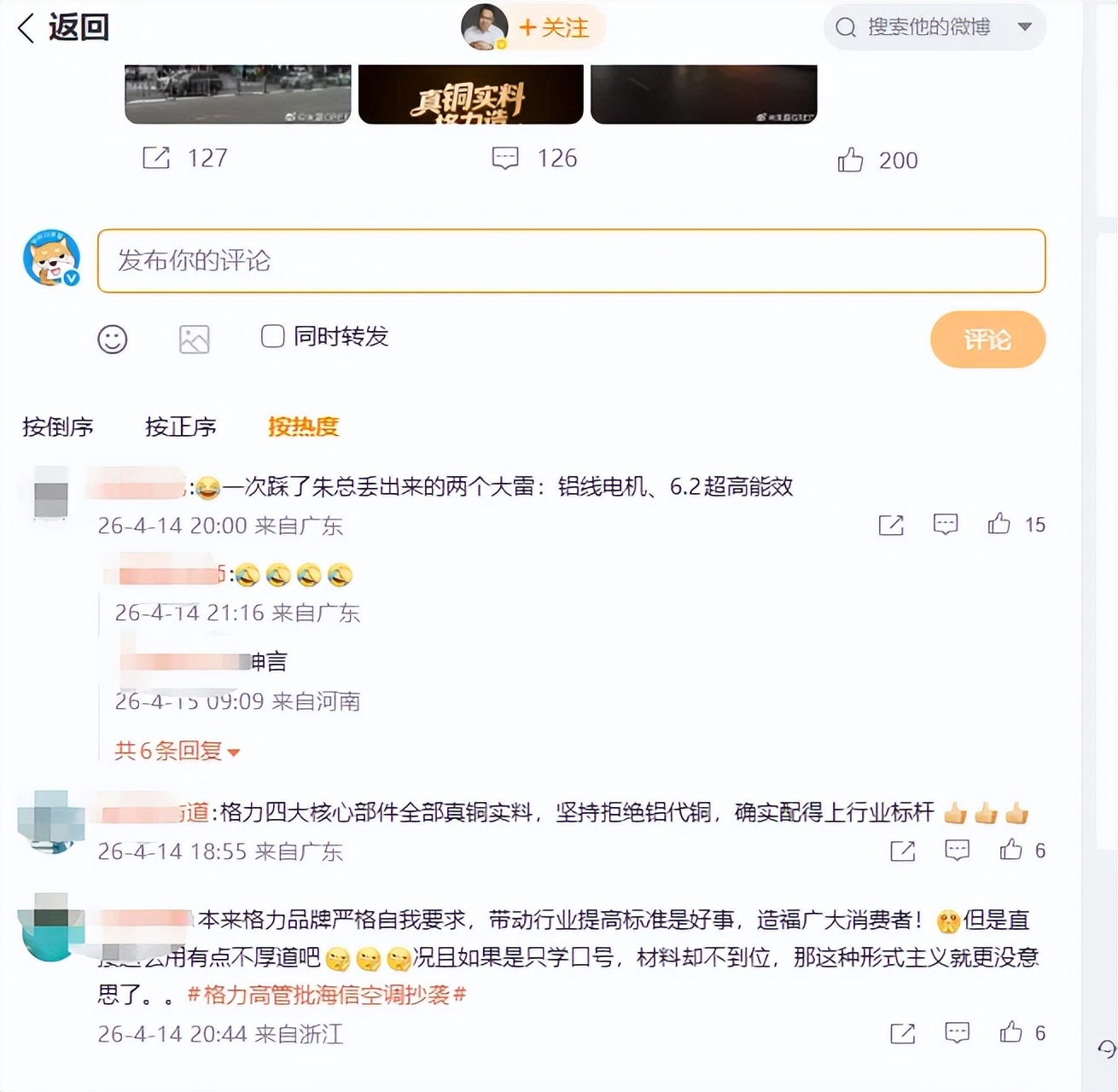 而对这一轮纷争,网友们也是看法不一,比如有网友在朱磊评论区表示:一次踩了朱总丢出来的两个大雷:铝线电机、6.2超高能效。还有人点赞格力是行业标杆。
