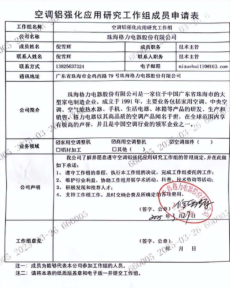 在这份申请表表中,格力声明:我公司了解并愿意遵守空调铝强化应用研究工作组的管理规定……维护行业利益,协助工作组开展学术活动,科普、技术咨询等活动。