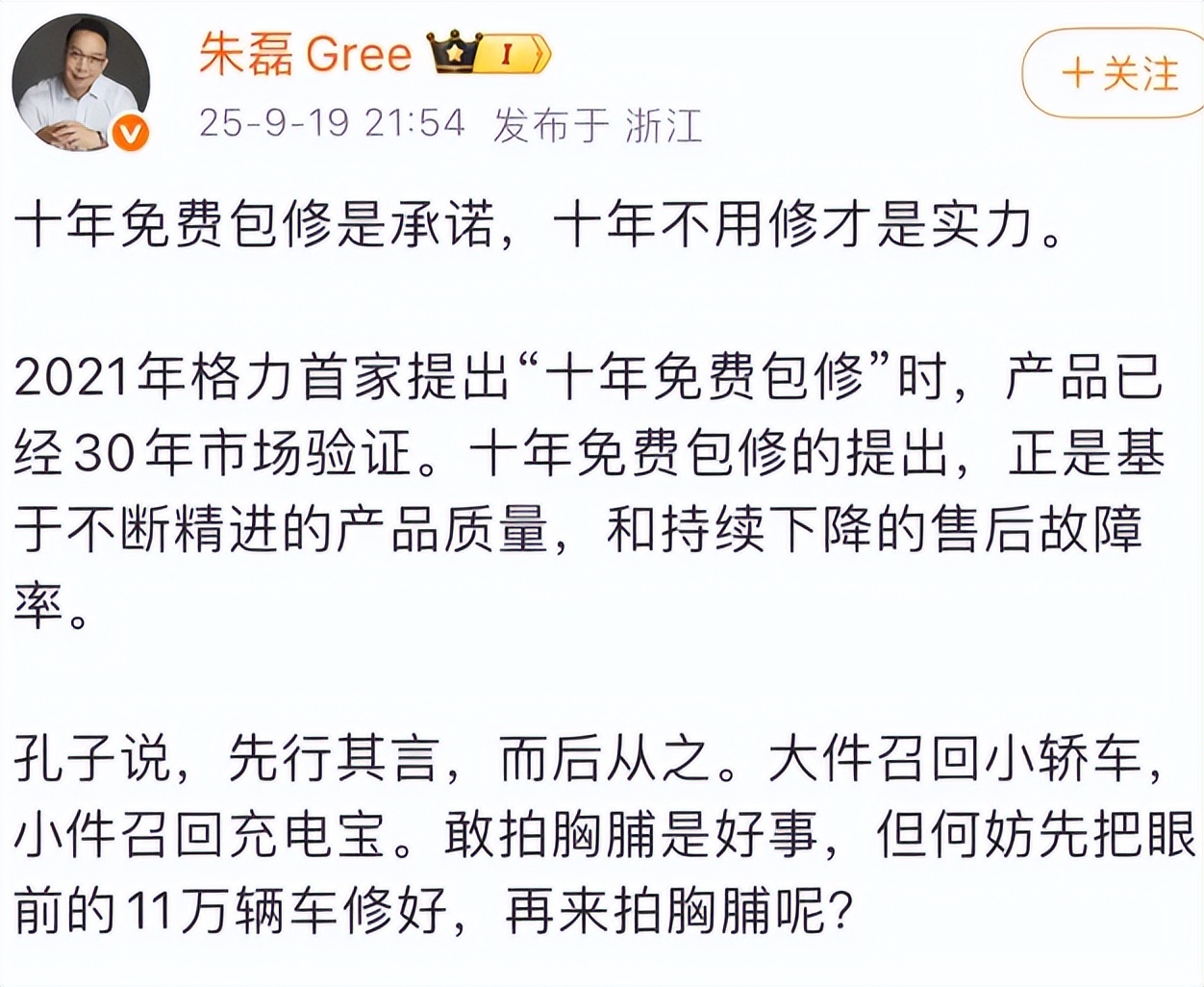 去年以来,和朱磊相关的多个话题冲上热搜,比如其去年和小米之间隔空喊话,让空调行业热闹了好一阵时间。卢伟冰官宣小米空调10年包修!格力高管:先把11万辆车修好……