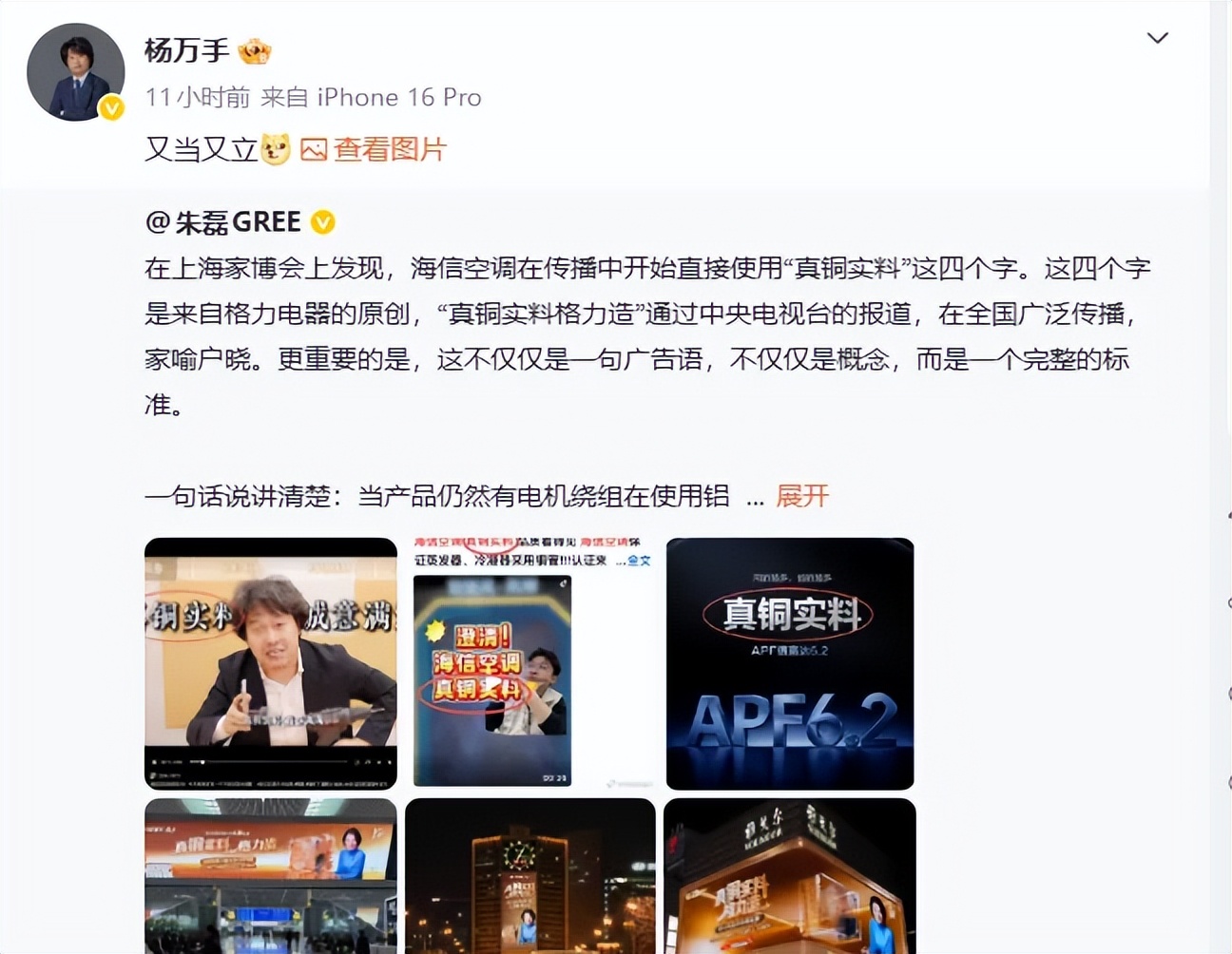 随后,海信高管杨万手转发朱磊这条动态回应:又当又立。