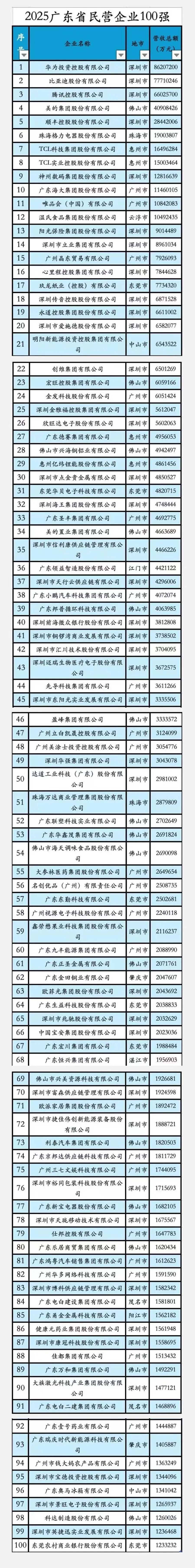 在2025世界粤商大会上,2025年广东省民营企业百强榜单正式揭晓,本次榜单由广东省工商联发布,以2024年企业营业收入为核心依据。