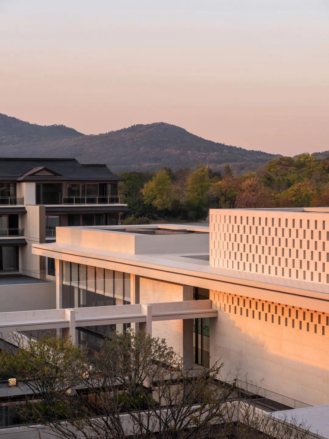 其形神取法金陵画派风骨,标志性的单檐歇山顶、大面积玻璃与贝金米黄石材、浅香槟铝板、深棕金属型材,经现代笔法淬炼,既有东方殿阁的庄重气韵,亦具当代艺术的锋芒辨识。