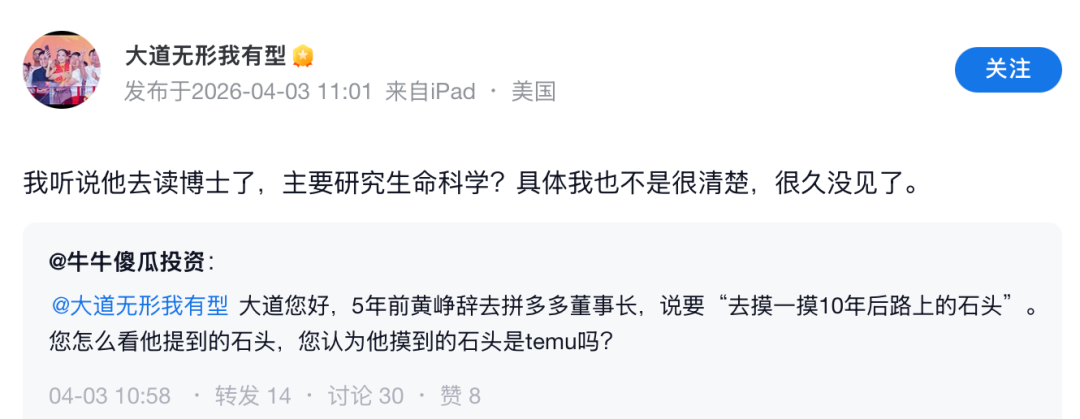 看似轻描淡写的一句话,将隐退已久的黄峥拉回公众视野。该帖子目前仍然存在。