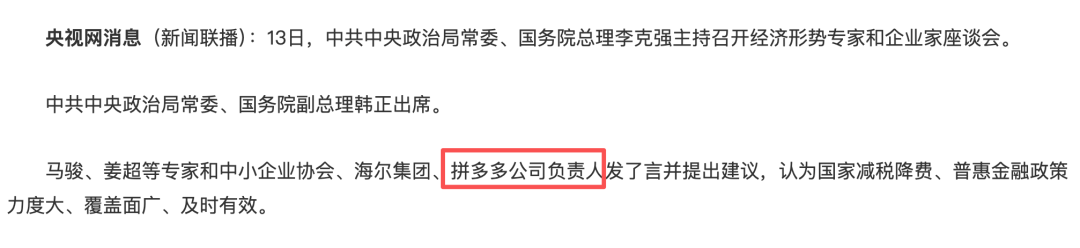 央视新闻报道称,2020年7月13日,时任中共中央政治局常委、国务院总理李克强主持召开经济形势专家和企业家座谈会,海尔集团、拼多多公司负责人发了言并提出建议。