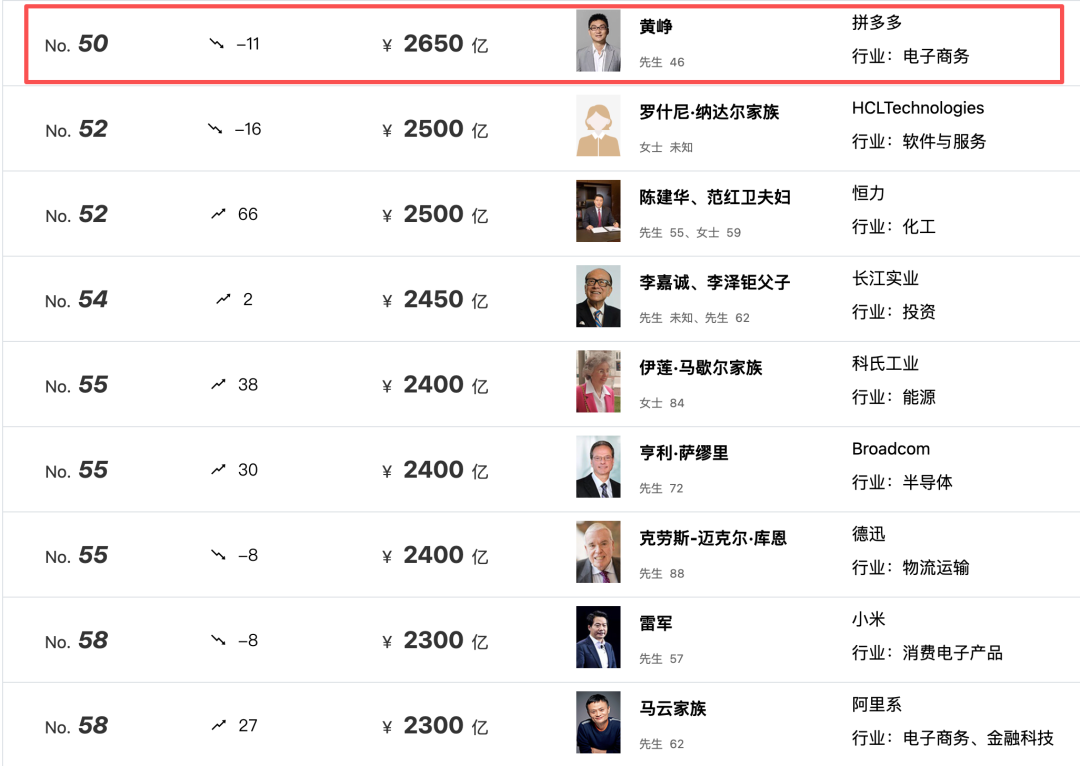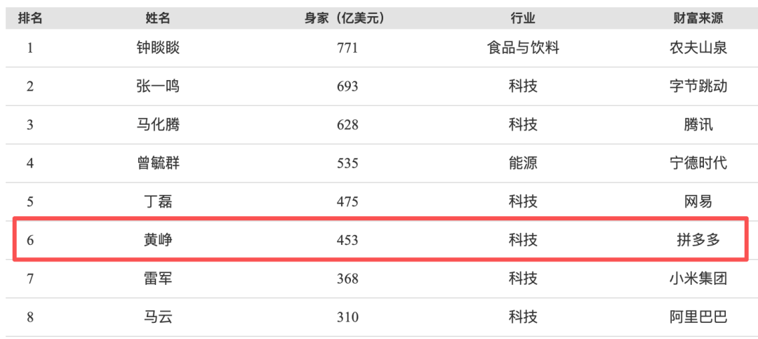 《2025福布斯中国内地富豪榜》显示,黄峥以453亿美元财富位居榜单第6位,超越了马云、雷军等科技公司大佬。