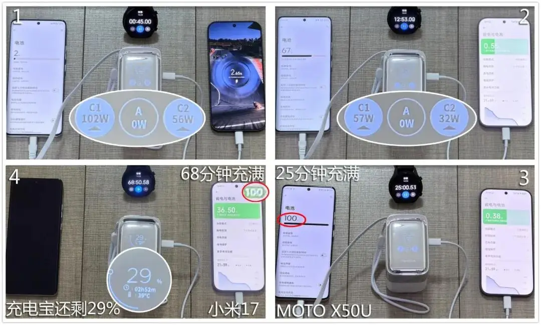 我采用MOTO X50 Ultra和小米17进行测(都放电至自动关机),充电宝最大输入功率分别是102W和56W,12分钟就给MOTO X50U充到了67%,速度惊人。后半程充电宝降到57W/32W且稳如狗,25分钟充满MOTO X50U,68分钟充满小米17,感觉跟手机原充不相上下。
