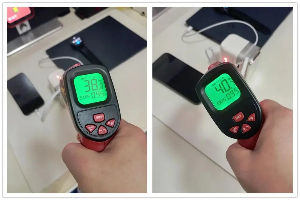 我在同时给笔记本和手机充电二十分钟后,用红外枪测量了外壳表面温度,顶部是38℃左右,侧面是40℃左右,摸上去温热不烫手。