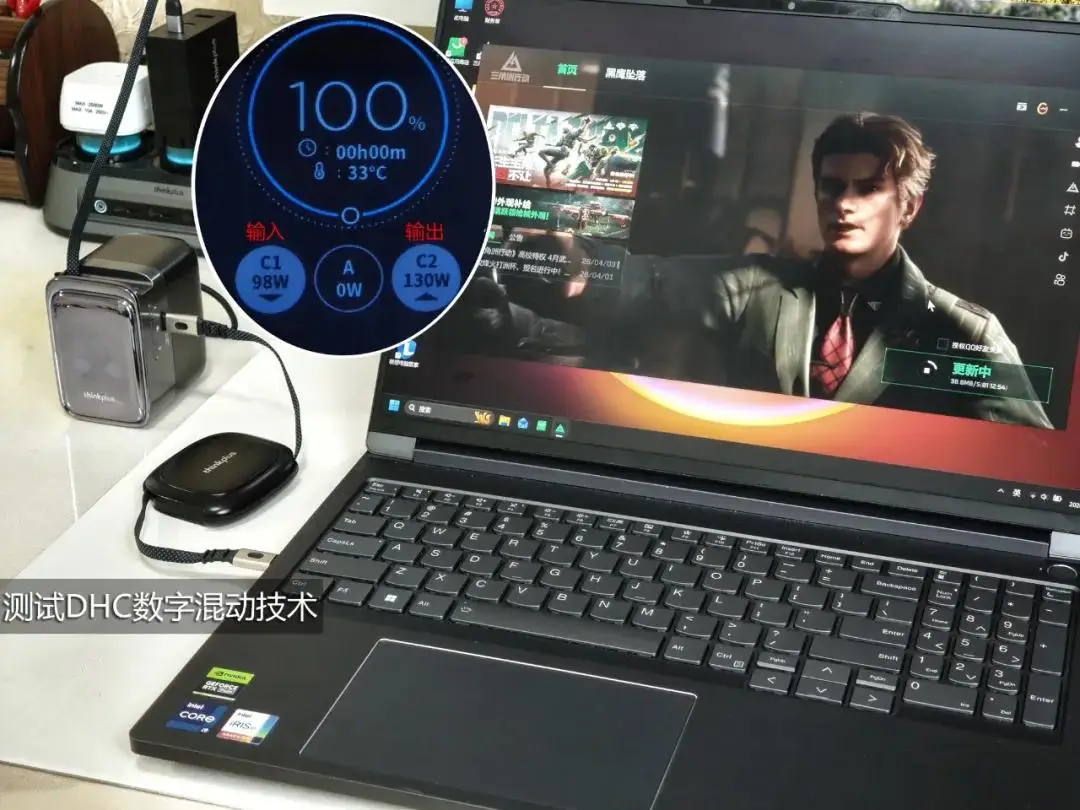 只要一头插在100W充电器,另一头经过充电宝插在ThinkBook 16P笔记本,就会发现输入功率才98W,但输出功率达到了130W,不仅解决了应急充电问题,还为出差行李减负。