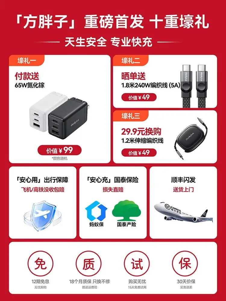 此外在新品首销期间,下单即送价值99元的thinkplus 65W氮化镓三口充电器,晒单还能再送价值49元的1.8米240W编织快充线。目前该产品已加入天猫“安心充电”计划,进入天猫搜索“安心充电”可直达专区选购产品,额外赠送一份“安心充电险”保单。